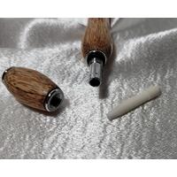 It takes many steps to create a piece like this. First, the blank is cut to size, a hole is drilled in the center and a brass tube is epoxied in place. After the epoxy is set, I turn the piece on the lathe to the desired shape and size. Then it is sanded with multiple grades of sandpaper up to 12,000 grit. Once sanded, I polish & buff it.