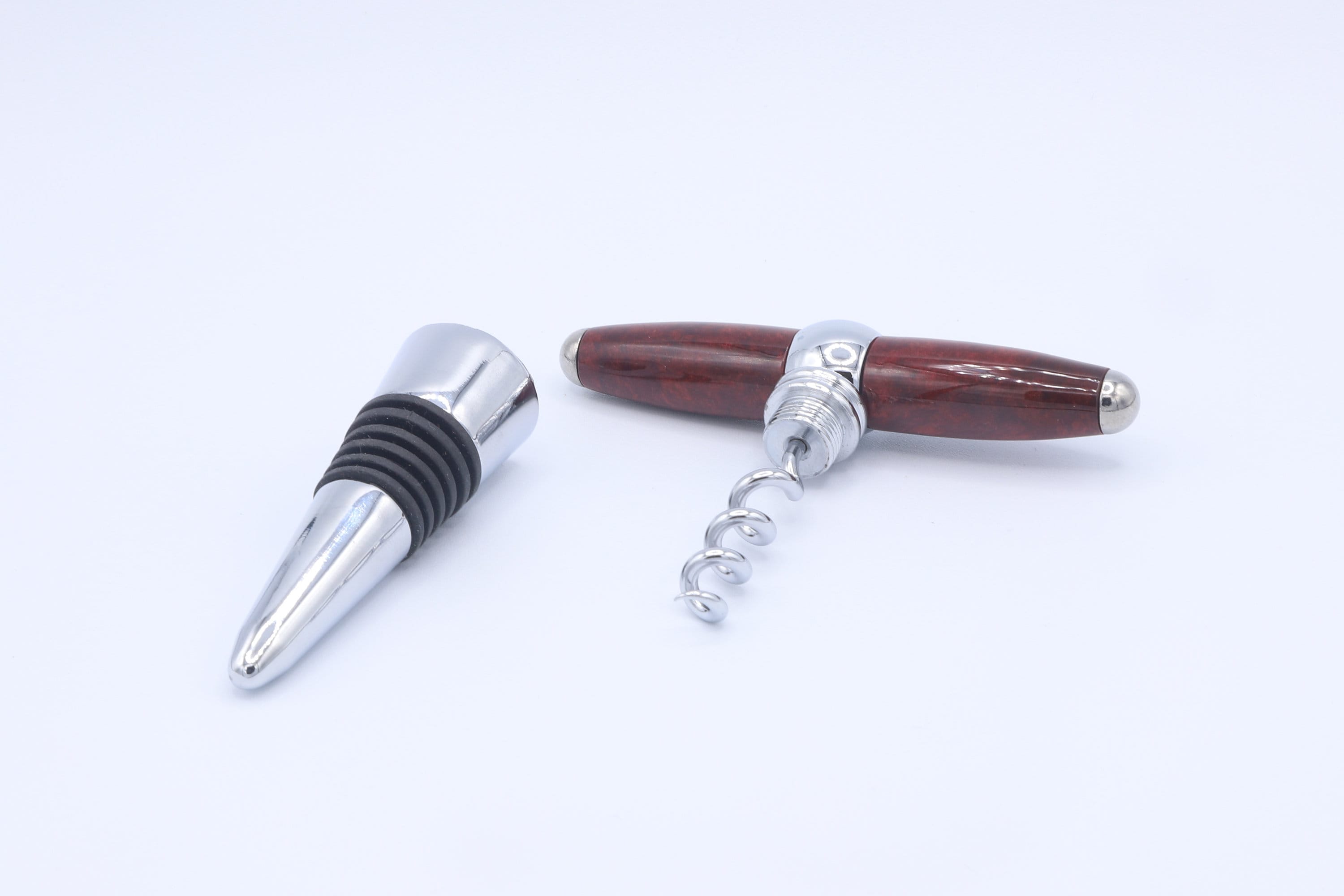 Two gifts in one! The stopper unscrews to revel a corkscrew and the "T" handle provides superior leverage for opening wine bottles. Silicone gasket on the stopper ensures a tight seal to keep your beverage fresh. This piece features an acrylic blank resembling marinara sauce (in both color and pattern) and chrome hardware.